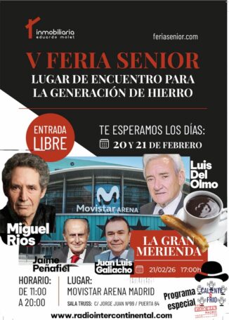 La V Feria Senior, organizada por Eduardo Molet, se celebra este viernes 20 y sábado 21 de febrero en el Movistar Arena de Madrid, en horario de 11:00 a 20:00 horas y con entrada gratuita. El evento espera reunir a más de 10.000 visitantes y contará con una previsión de alrededor de 50 empresas expositoras especializadas en salud, cuidados, seguros, vivienda, ocio, tecnología y autonomía personal.