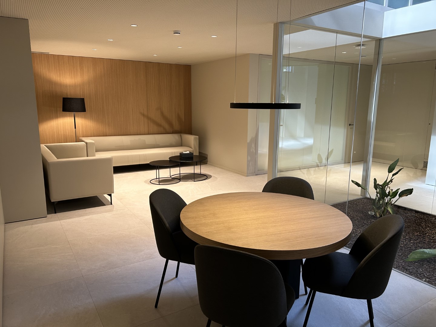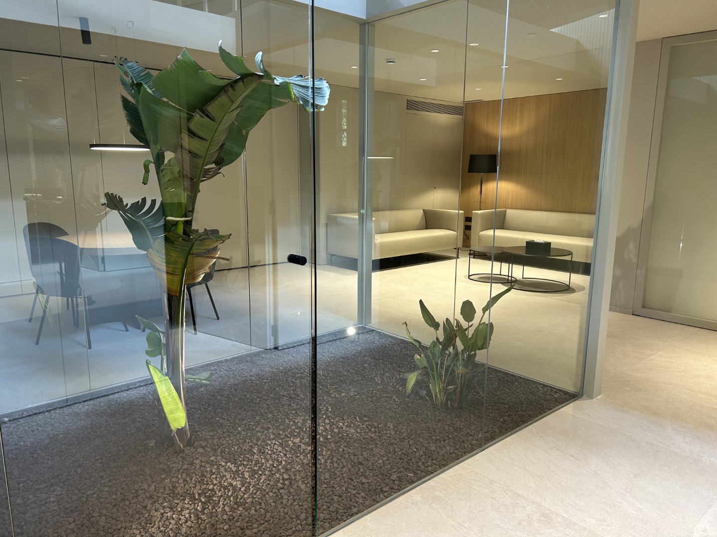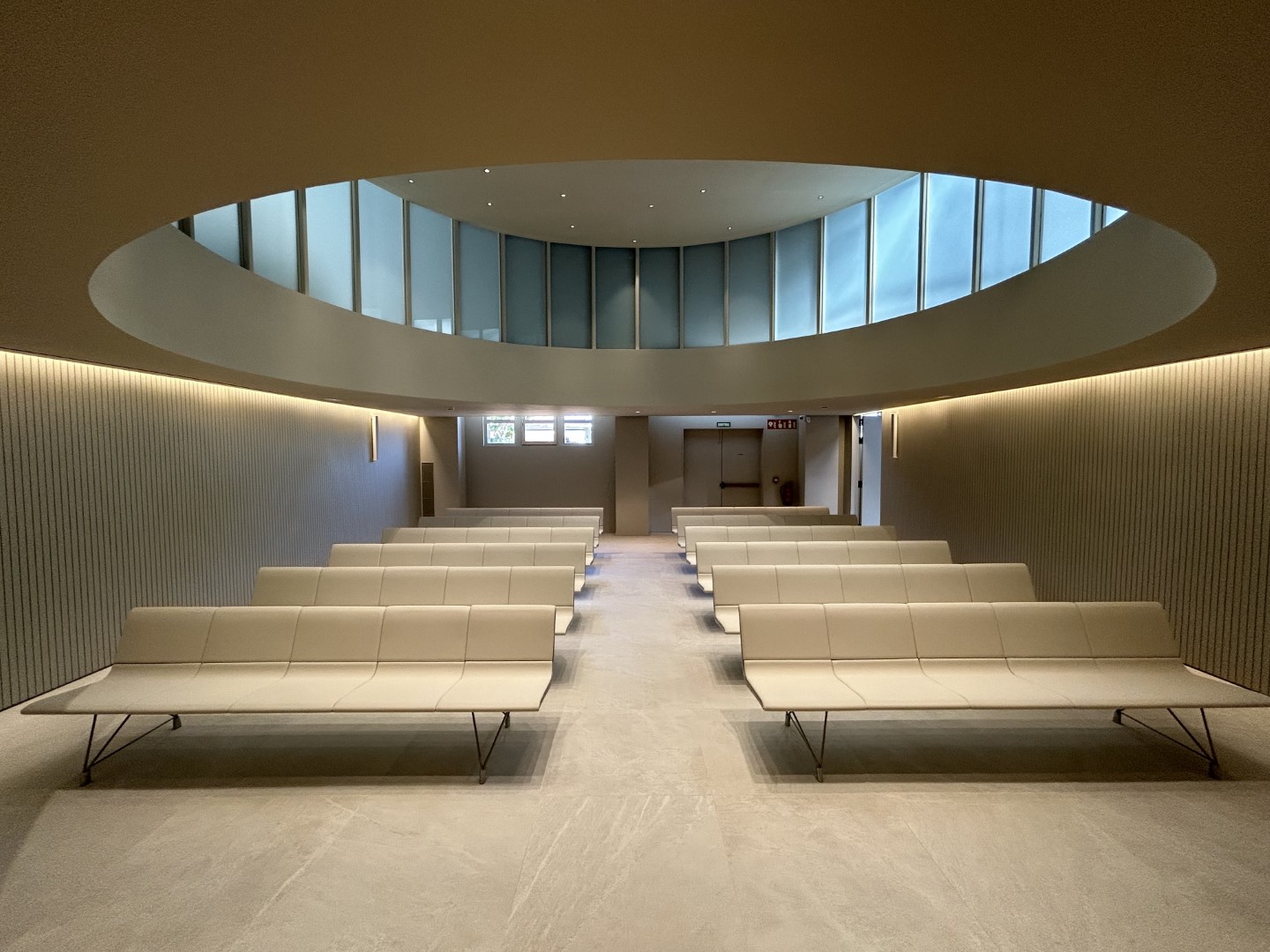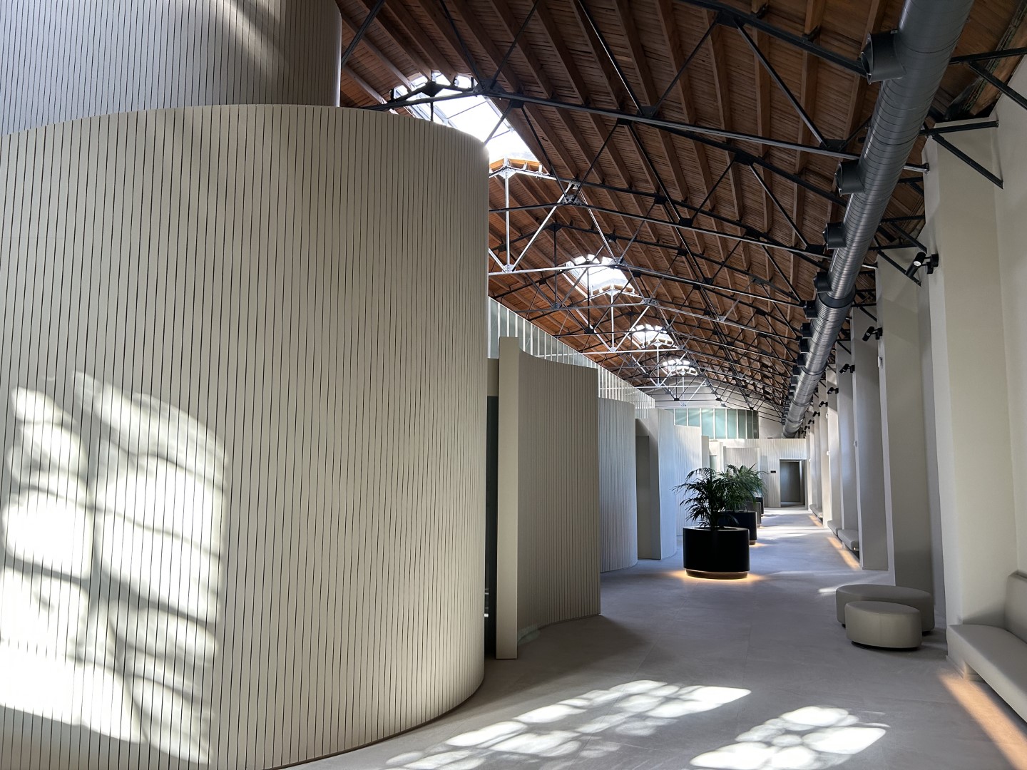 La nueva edificación del Tanatorio, que se sitúa en el interior de manera longitudinal a lo largo de toda la nave, permite con esta disposición, que la cubierta se pueda apreciar en toda su longitud y dimensión, dando protagonismo a estos elementos. En la propuesta de MIRAG Arquitectura, predominan las formas curvas, los colores claros y uniformes, para dotar a la instalación de calidez, elegancia y sosiego. La recuperación de la madera original de la cubierta y el tono algo más oscuro de sus bóvedas, contrastan con la propuesta de colores más claros del resto de volúmenes, dando un toque industrial al proyecto, y de nuevo aportando calidez a la instalación.