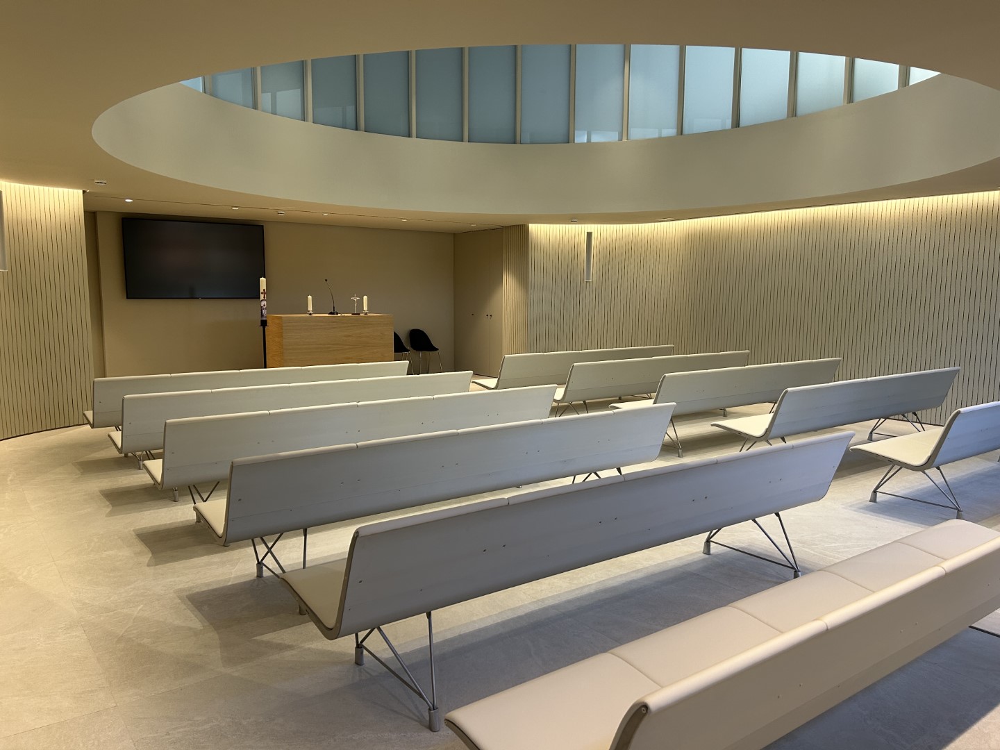 Toda la construcción se ha ejecutado en madera, tanto para la estructura como para los acabados principales, de forma que, a futuro, la propuesta podría desmontarse y dejar intacto el patrimonio histórico. Los tabiques principales de las salas de vela se trazan de forma sinuosa, con curvas, para asemejarse a una escultura atemporal y con formas orgánicas que acogen a los usuarios de la instalación. Por el contrario, los volúmenes de las oficinas y la sala de ceremonias son formas geométricas más puras, ligadas a la espiritualidad. Con el conjunto de estas decisiones, se consigue que la nueva edificación contraste con la original, sin restarle todo el protagonismo que merece.